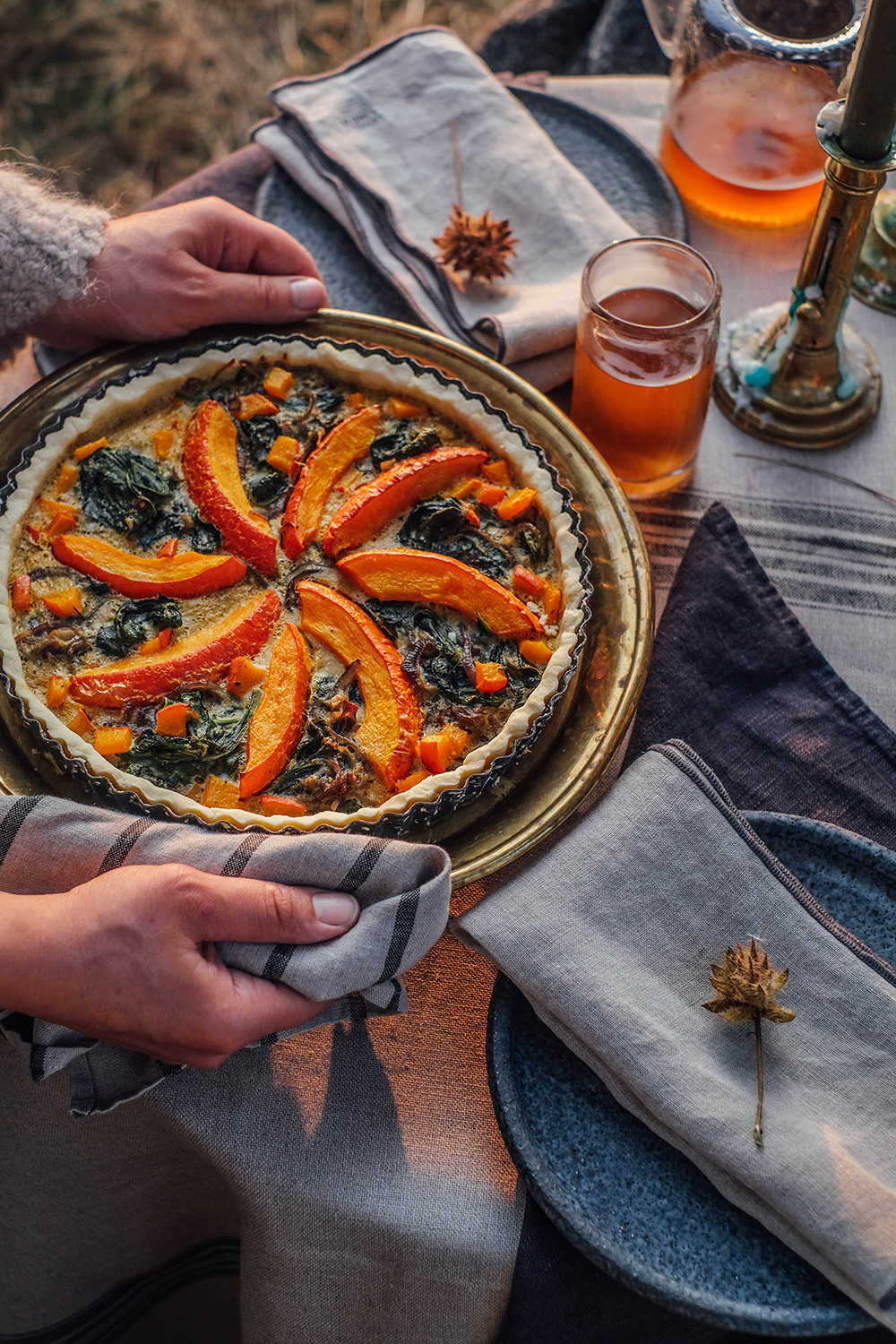 My dears! We took these photos over a year ago for a Swedish client of ours who makes wonderful linen products – Lovely Linen. And since we love the recipe so much and wanted to share it with you, here it is – perfect for the cozy season – the delicious pumpkin quiche recipe with spinach and feta. Quiche is such a great autumn and winter dish. It’s warm, comforting, and so easy to share. And once you have the basic recipe, you can easily change the vegetables to suit your mood. For example, if you don’t like spinach, you can easily replace it with Brussels sprouts or other vegetables.