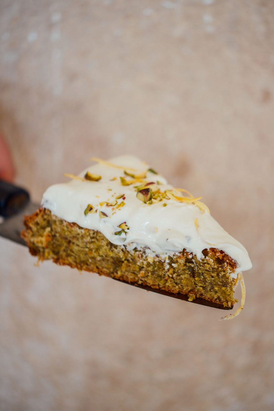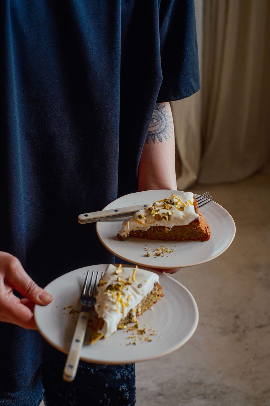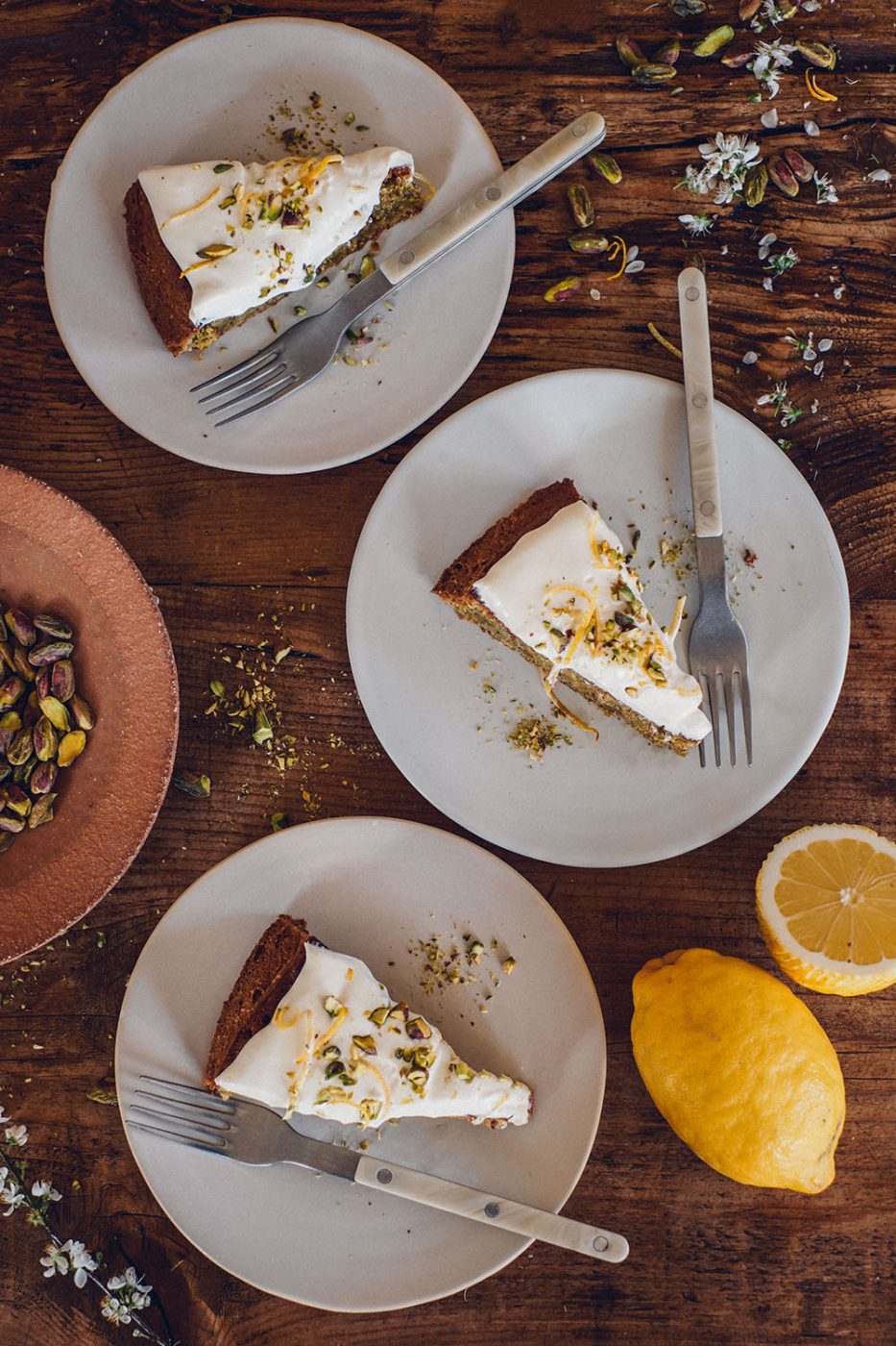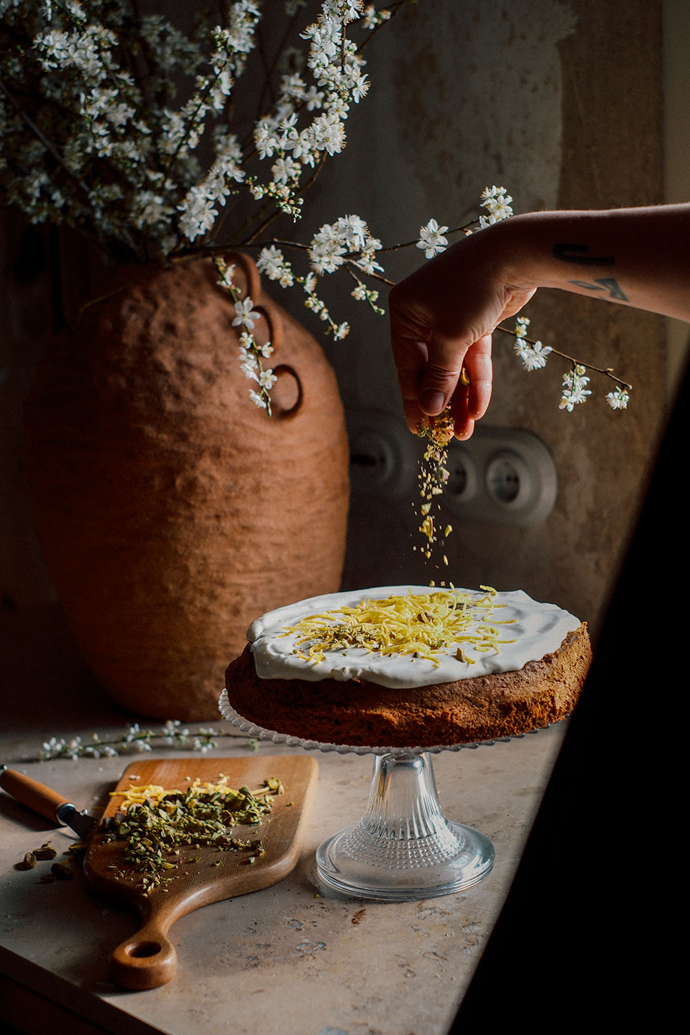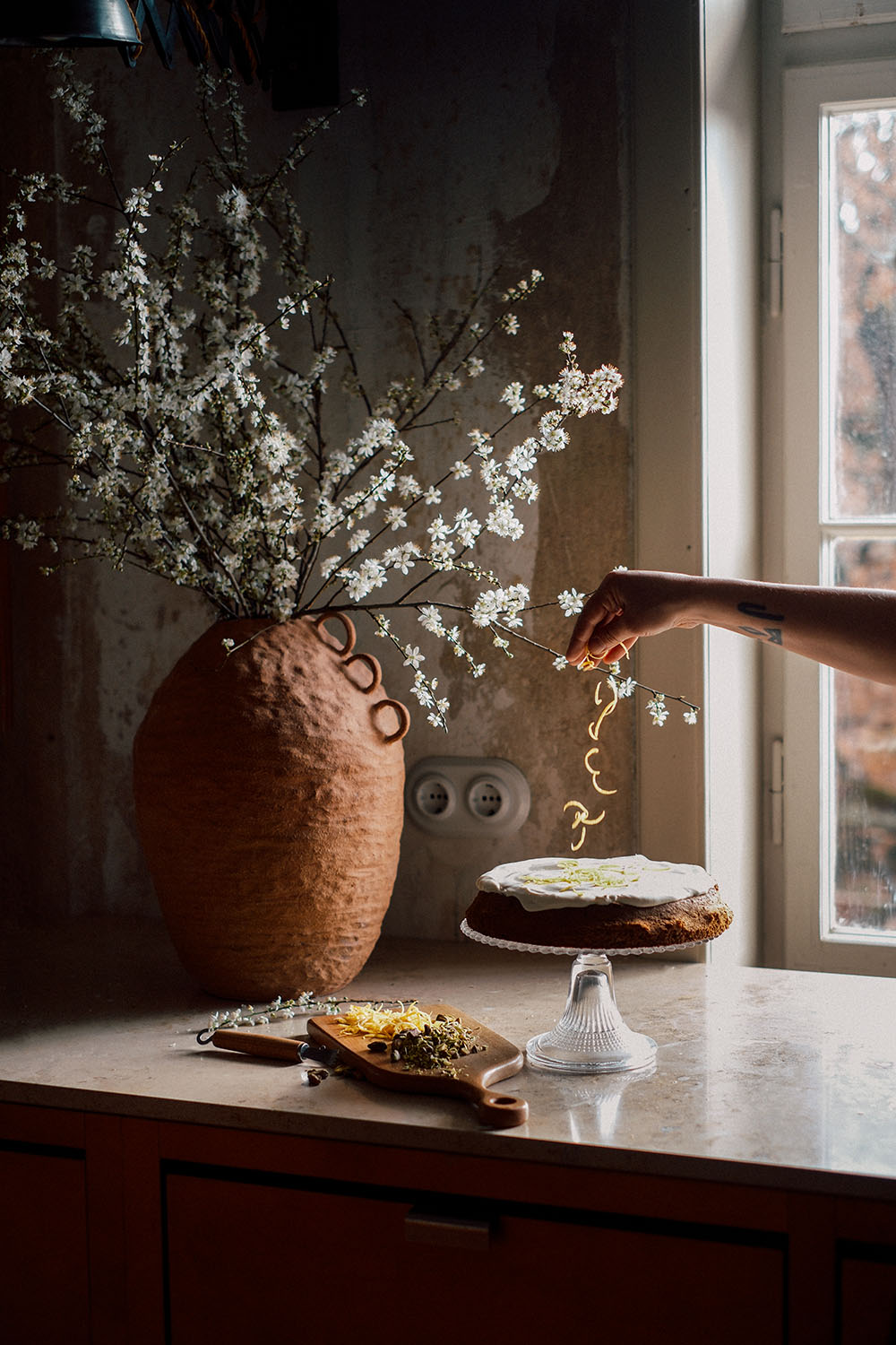 We are long time admires and I can’t wait to use their delicious chili and garlic oil for all the spring and summer salads again. But back to the recipe – this tasty pistachio cake is topped with a mascarpone cream and lemon zests, which is such a good and fresh combination. Thanks to the pistachios it has a wonderful green color and really feels like spring on your plate! If the temperatures would have been warmer already we would have photographed it outside under a blooming tree, but I guess we have to be patient for a little longer. So instead we picked these gorgeous plum blossoms from my neighbors garden and with some wonderful sun beams entering the kitchen, it really felt like spring arrived! We hope you guys enjoy the recipe – you’ll find it over on our Substack, so have a look here. Happy baking!